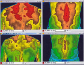Die oberen beiden Infrarotfotos zeigen Entzündungsbereiche im Nacken, an den Schultern und dem unteren Rücken. Innerhalb von 5 Minuten nach der Applikation der LifeWave-Schmerzlinderungs-Patches wird eine dramatische Reduktion der Temperatur und Entzündung beobachtet. Diese Fotos wurden im Rahmen einer doppelblinden, placebokontrollierten Studie aufgenommen. Das Gesamtergebnis war, dass 34 aus 36 Personen wie oben auf die IceWave Patches ansprachen.
